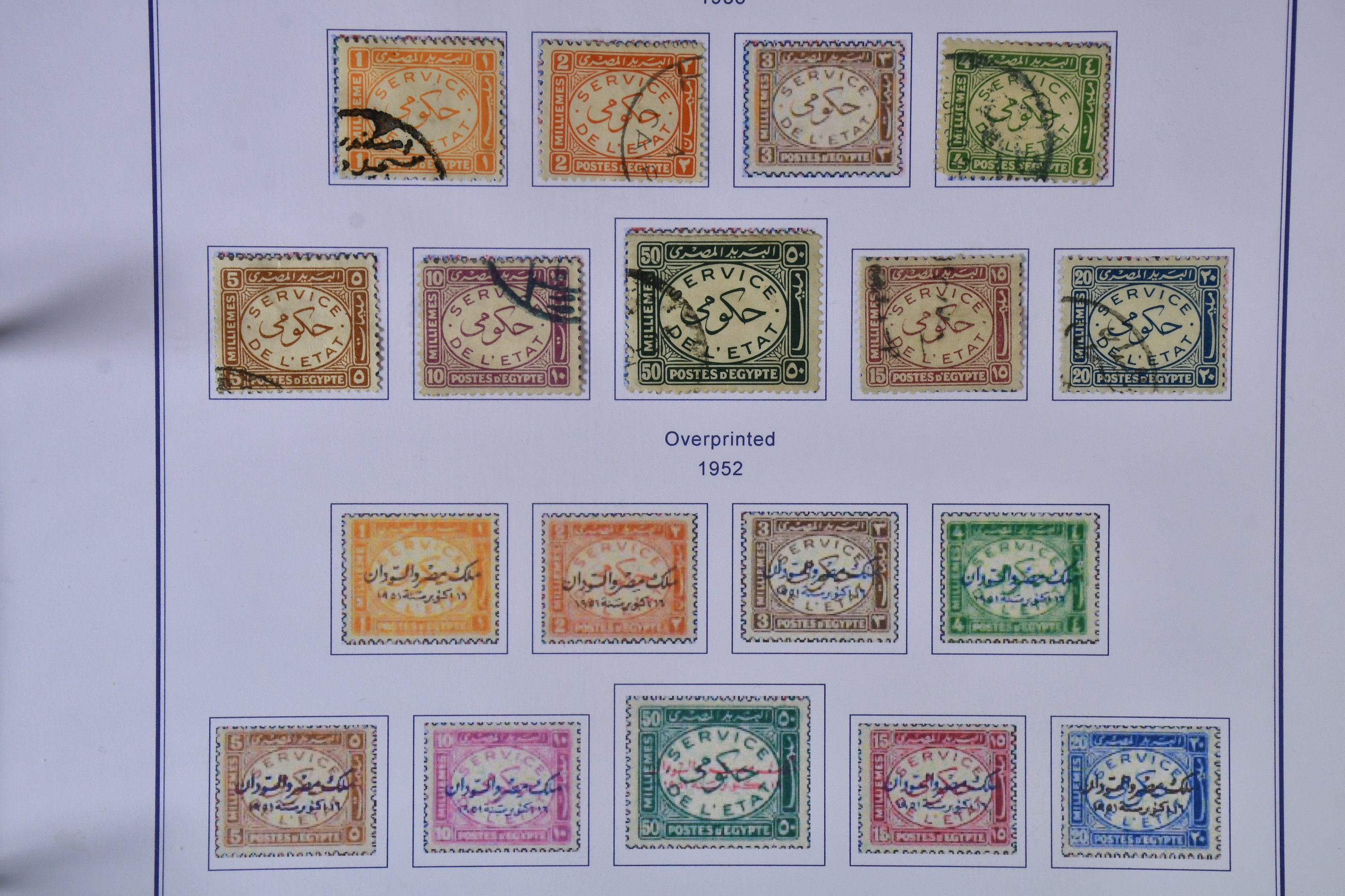 Egypt. Used 1867-1958. Useful used collection housed in one album, made for purpose with illustrations beginning with the 1867 sphinx and pyramid types to 2pi blue, followed by the 1872/75 thick opaque papers to 2pi various shades, then a similar pattern on the 1874/5 to 2 1/2pi, followed by the 1878 o/ps pair, 1879/81/82 through to the 10pi, 1898/09 various shades etc. Early 20th cent with further defins to 200mi new currency, etc. Then various postage dues and officials, a range of British forces in Egypt, followed by 1933 zepps complete and much more. Also a good range of the bar overprints, complete airplane over Giza, delta dam complete and further back of the book inc postage dues from the 19th century, etc, all completely uncatalogued.