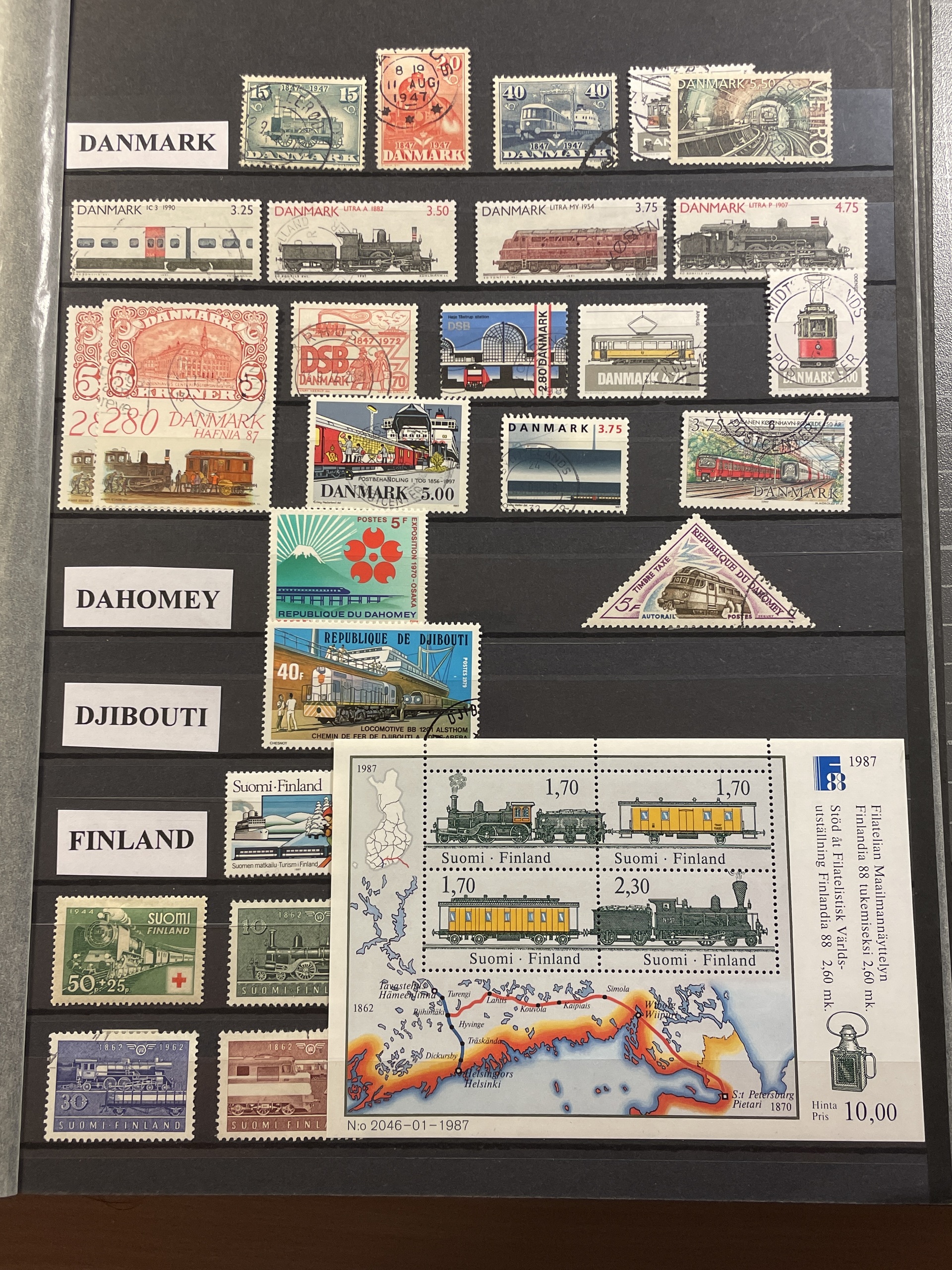 Thematics, Trains. Collection/accumulation ★★/★/⊙ 1900s in stockbook. Trains/engines on stamps from all over the world. Please see a selection of scans at www.philea.se. Fine quality. (>300)