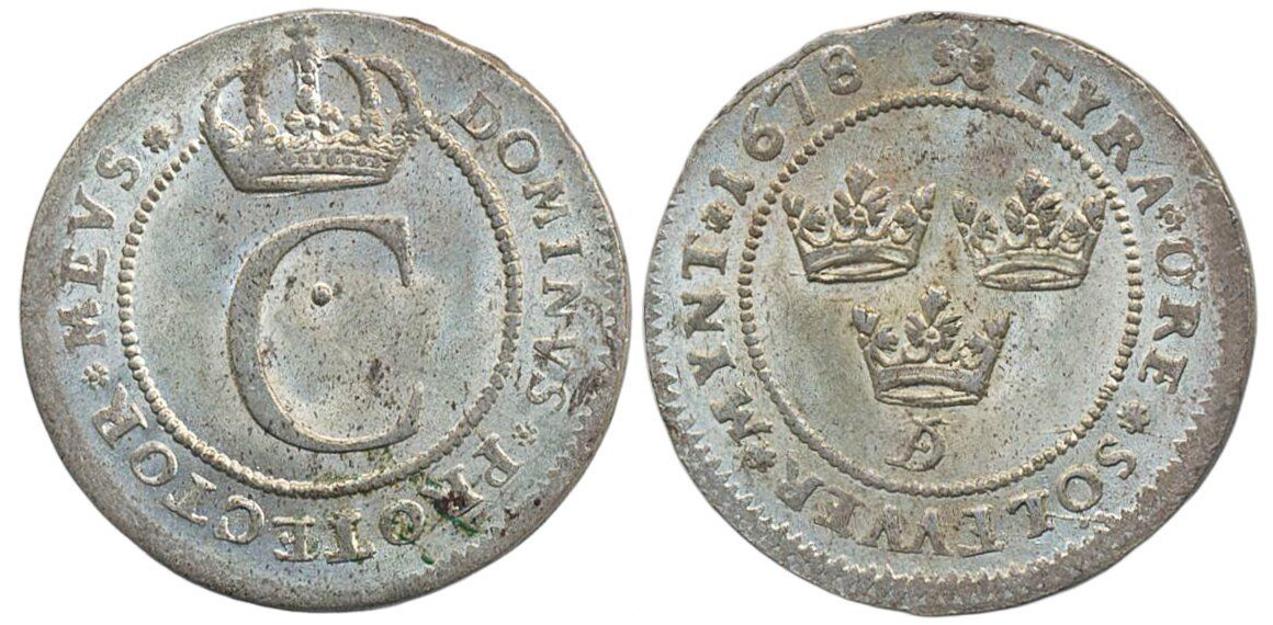 Coins, Sweden. Karl XI, SM 207, 4 öre 1678. 3.43 g. Stockholm. A magnificent example that is well struck and has full lustre. 01/0.