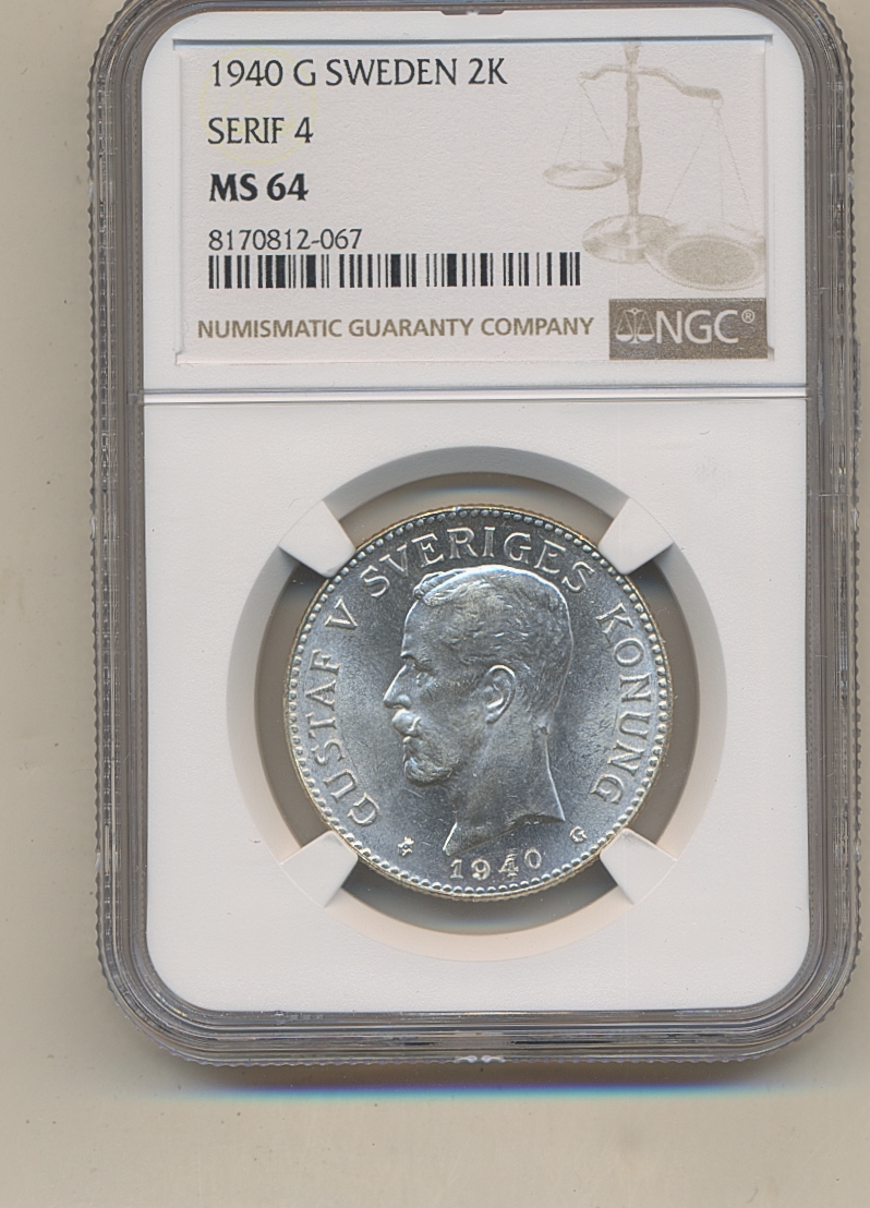 Coins, Sweden. Gustav V, MIS I.20b, 2 kronor 1940. Re-punched 4 in date – better variety. Graded by NGC as MS64. 01/0. See certification at NGC