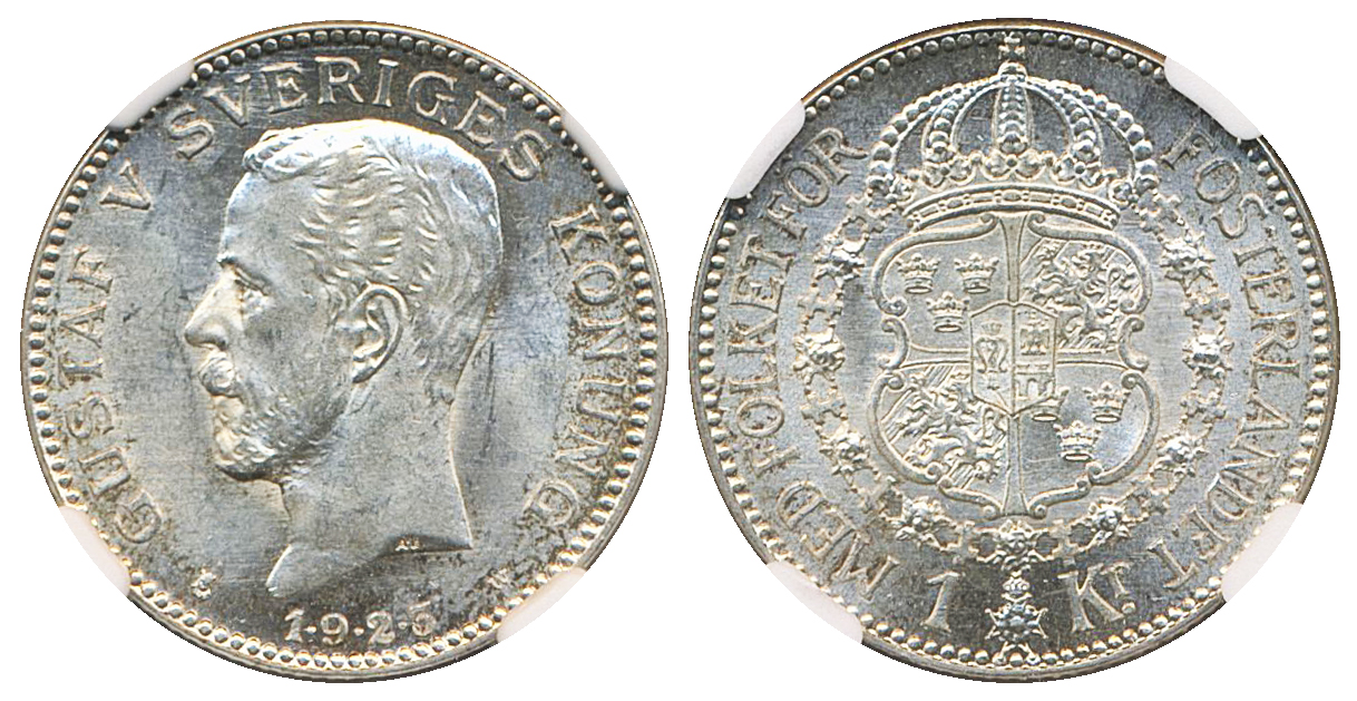 Coins, Sweden. Gustav V, MIS I.8, 1 krona 1923. Graded by NGC as MS64. 01/0. See certification at NGC