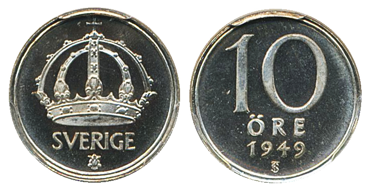 Coins, Sweden. Gustav V, SM 175, 10 öre 1949. Graded by PCGS as MS67PL. A beautiul specimen with prooflike fields. 0. See certification at PCGS