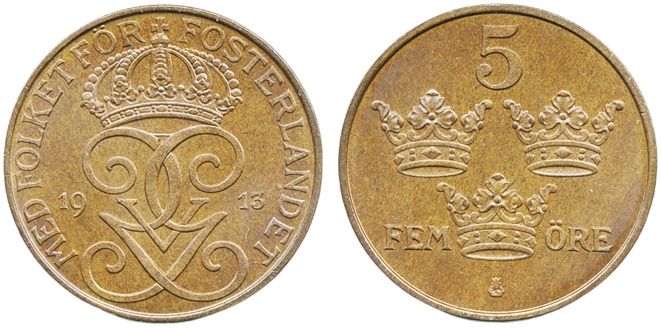 Coins, Sweden. Gustav V, MIS I.5, 5 öre 1913. Beautiful example with lustrous surfaces. SM 181. SMB 232. 0.