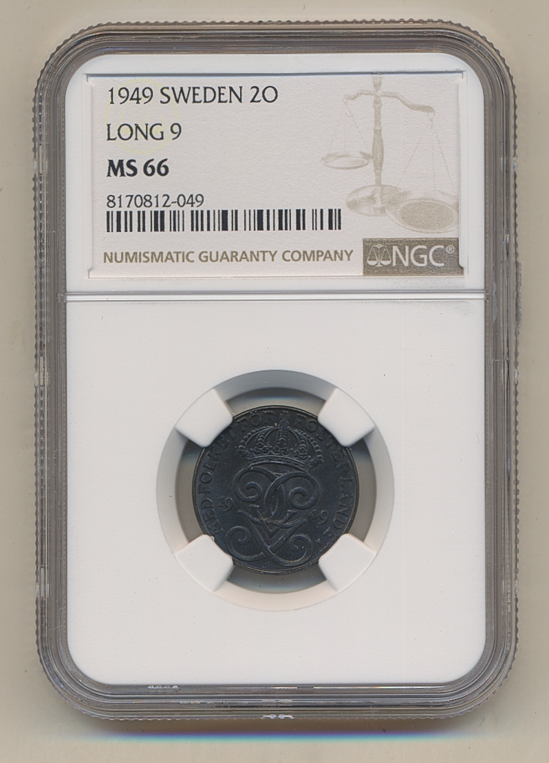 Coins, Sweden. Gustav V, MIS II.13a, 2 öre 1949. Long 9. Superb example! Graded by NGC as MS66. Tied finest graded by NGC. 0. See certification at NGC