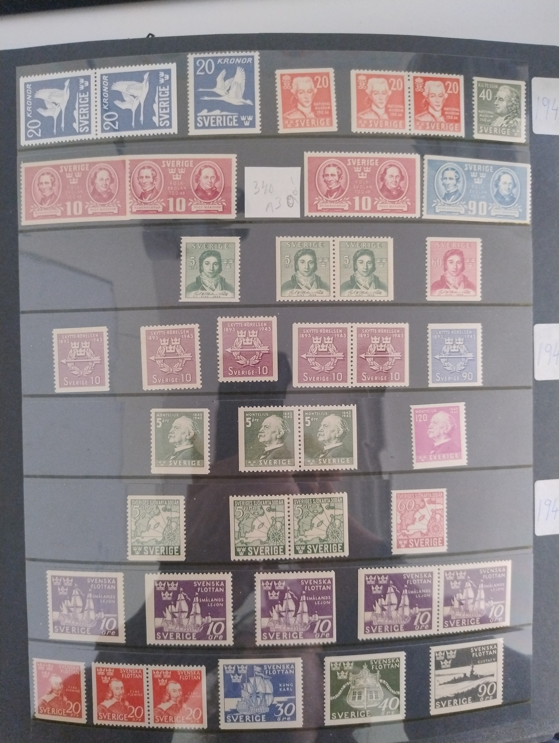 Sweden. Accumulation ★★/★/⊙ 1858–1984 in box. Seven remainder collections incl. much mint 1930s–1980s incl. some BC/CB pairs, one album with cancel interest and a used album with a few better stamps. Mostly good quality. Approx. 10 kg. (1000s)