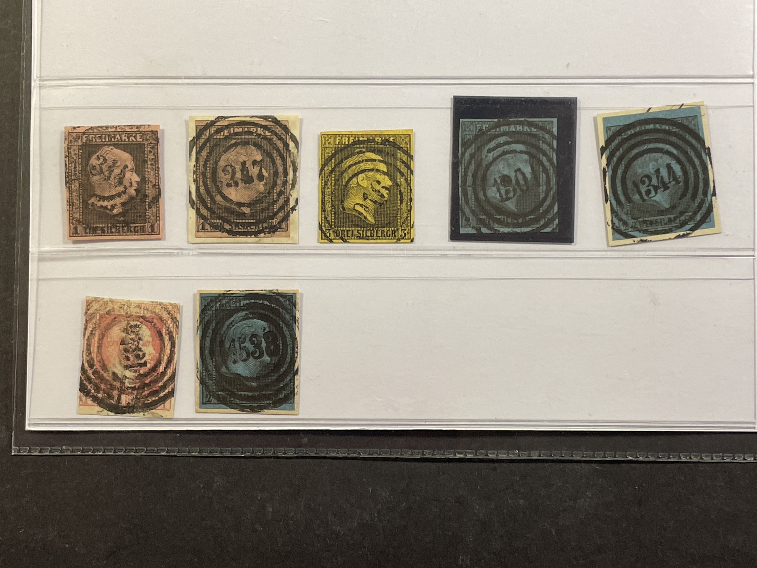 Germany, Prussia. Lot used 1851–1857 on stock cards. Prussia #2 with numeral cancellation "311" (Deilitzsch) and "247" (Chodziesen), #3 with numeral cancellation "1301" (Samoczin), "1344" (Schneidemuehl) and "1538" (Uscz), #4 with numeral cancellation "916" (Margonin) and #6 with numeral cancellation "1344" (Schneidemuehl), all in RB BROMBERG. Fine quality. (7)