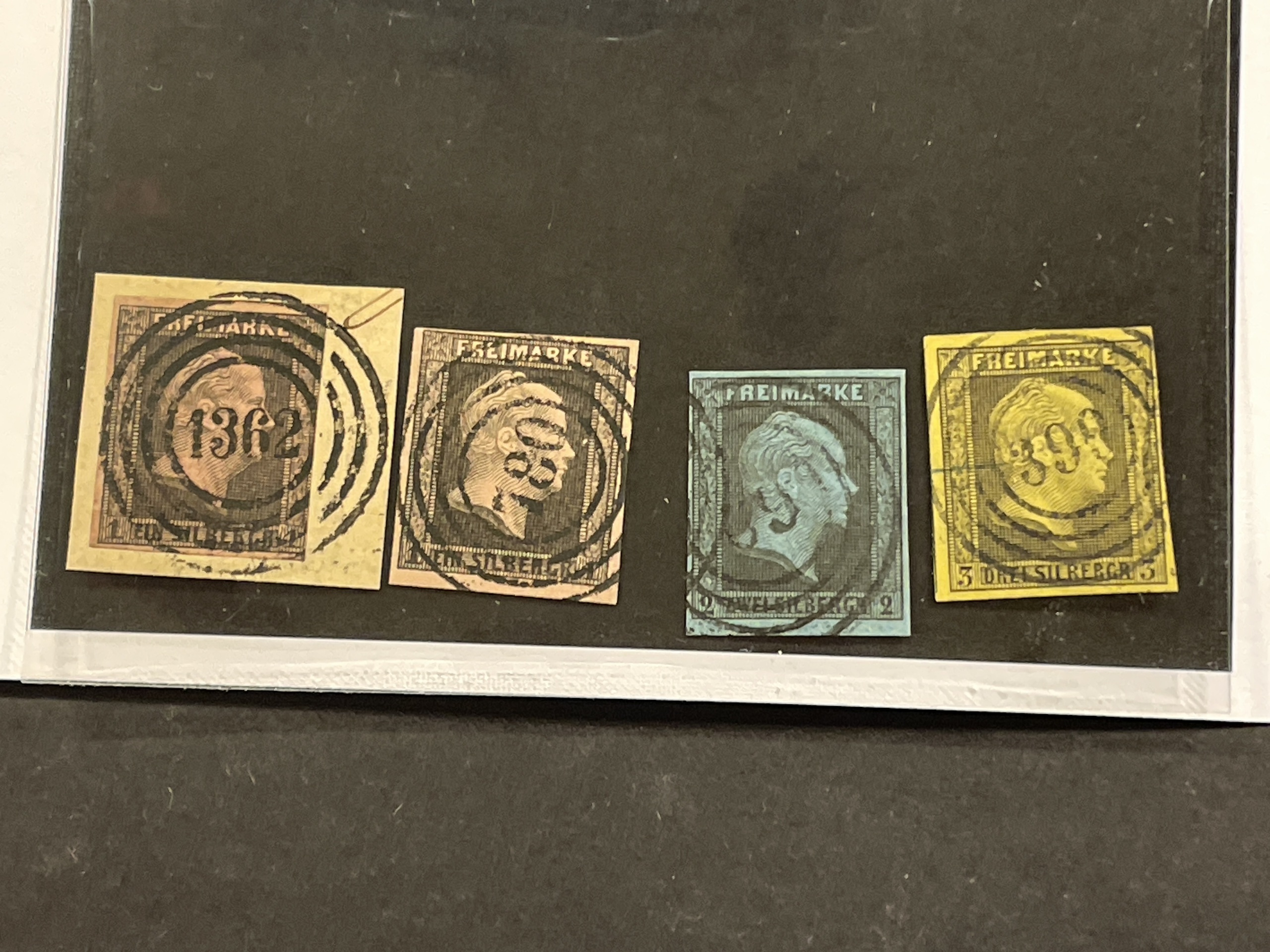 Germany, Prussia. Lot used 1850–56 on stock cards. LK SCHUBIN (RFB Bromberg, Posen). Prussia # 2, two copies with numeral cancellations 780 - LAB ISCHIN and 1362 - SCHUBIN , # 3 with a numeral cancellation 69 - BARCYN, # 4 with a numeral cancellation 399 - EXIN. Mostly fine quality. (4)
