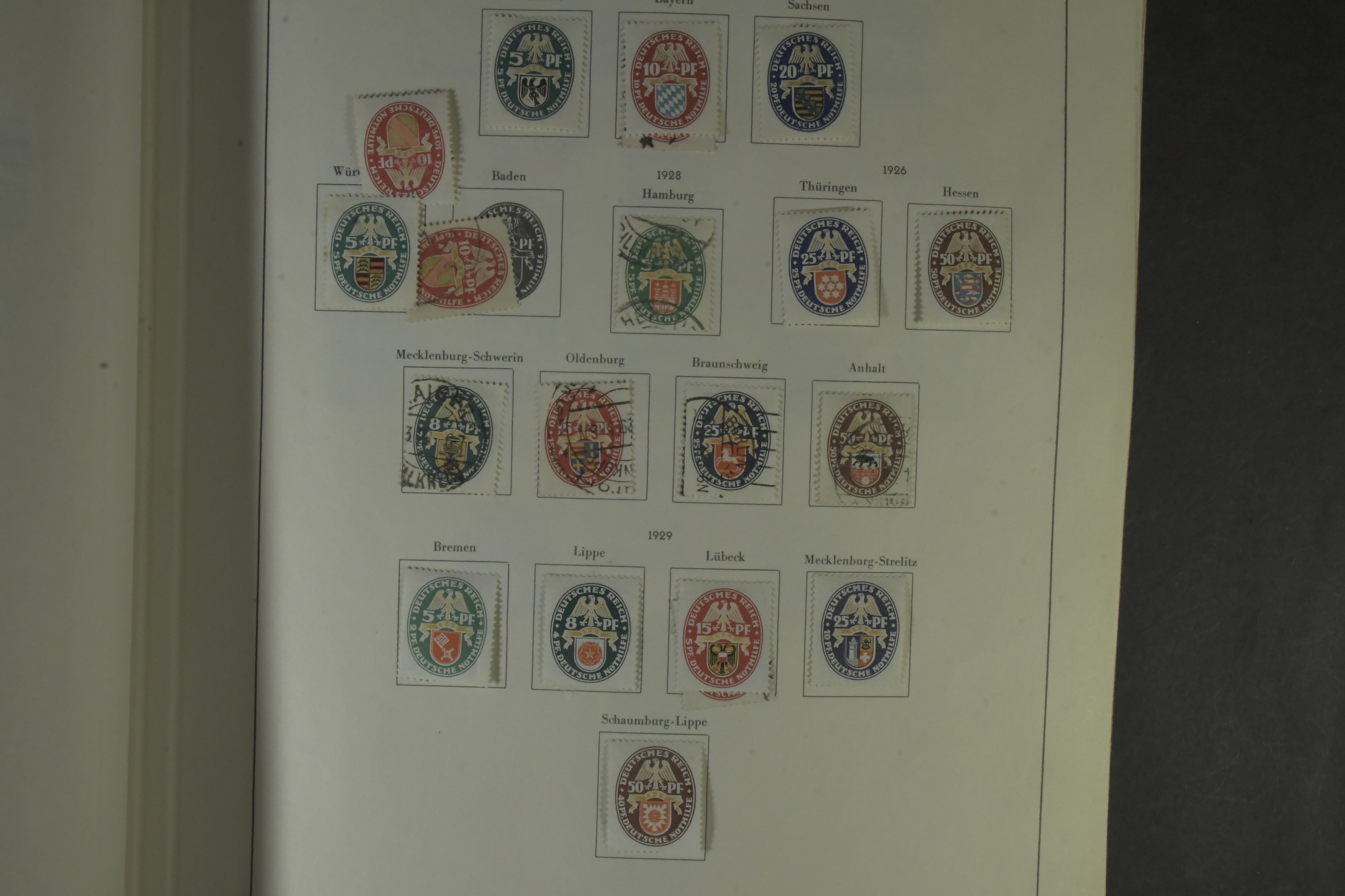 Germany, mixed. Collection ★★/★/⊙ 1872-1972 in old Leuchtturm album. Reich first used then more x/o incl smoe Eagles, 5mk Reichpost, well-filled inflation period, IAA 1927 x, many Nothilfe sets, Wagner cpl used (20pfg x), Third Reich cpl x/o excl Chicagofahrt and s/s 2-3, some German WW2 occupation incl e.g Channel Islands, Allied occupation common issues s/s 1-2 x, Am/Br zone with many ribbon and net ovpts, BRD cpl mainly x in value but Post Horn used, 50pfg Heuss xx and from 1959 almost all xx. Some x stamps with highhes mounted hard to paper. Very high value. Mostly fine quality.
