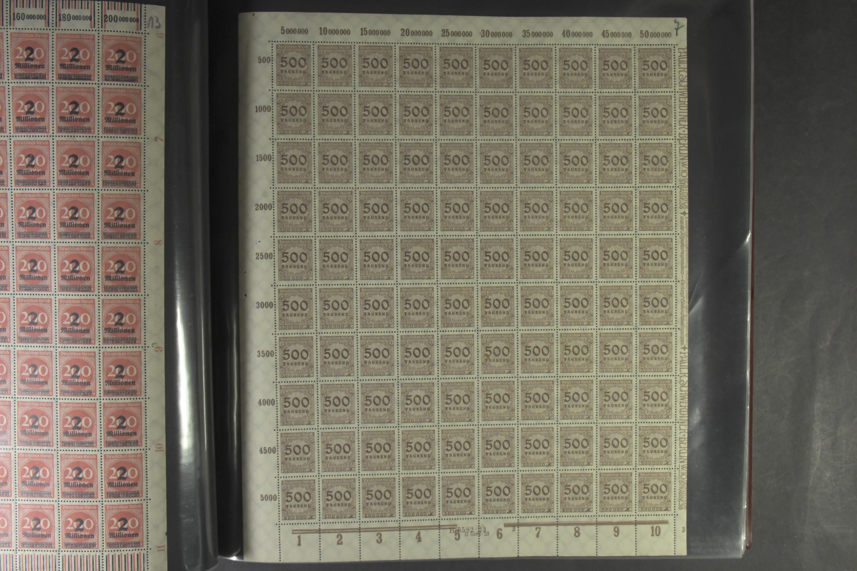Germany, mixed. Collection/accumulation mostly ★★ 1920s–1980s in two albums. One large sheet album and one album with part sheets. Lots of stamps incl. full sheets and large parts of sheets from Infla period and to 1945 and some later also a few from other countries. Somewhat mixed quality.