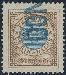 Sweden. Facit 37 used, 1 Riksdaler brown/blue. Interesting example cancelled with blue (FRA)NCO. Certificate and signature by Hunziker (1967).