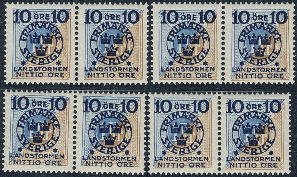 Sweden. Facit 124a ★★, 1916 Landstorm II 10+NITTIO / 1 kr blue/greyish brown. Four very fine–superb PAIRS. SEK 16000