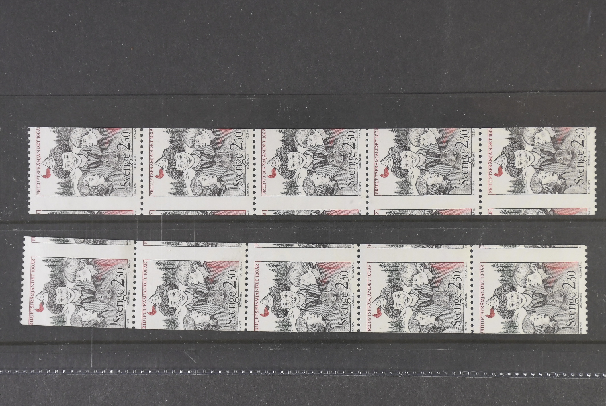 Sweden. Facit 1721 ★★, 1992 Outdoor Lift Association 2.30 Kr multicoloured (1). Two strips of five, wrongly cut.