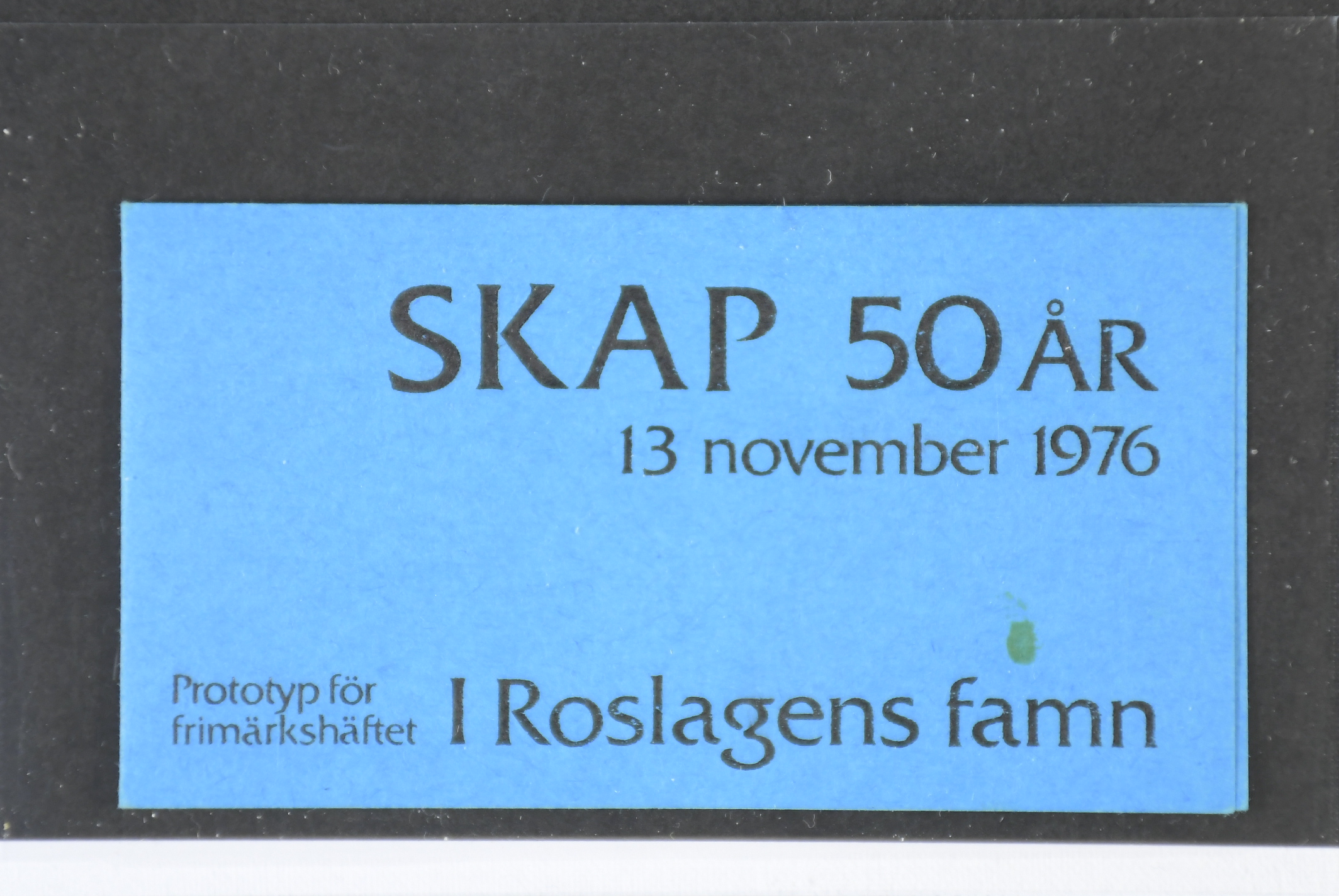 Sweden. Booklet Facit H298, 1977 In the Heart of the Roslagen 95 öre. "SKAP 50 ÅR 13 november 1976. Prototyp för frimärkshäftet I Roslagens famn". With value 1 kr instead of 95 öre. (Small natural spot from production on cover).
