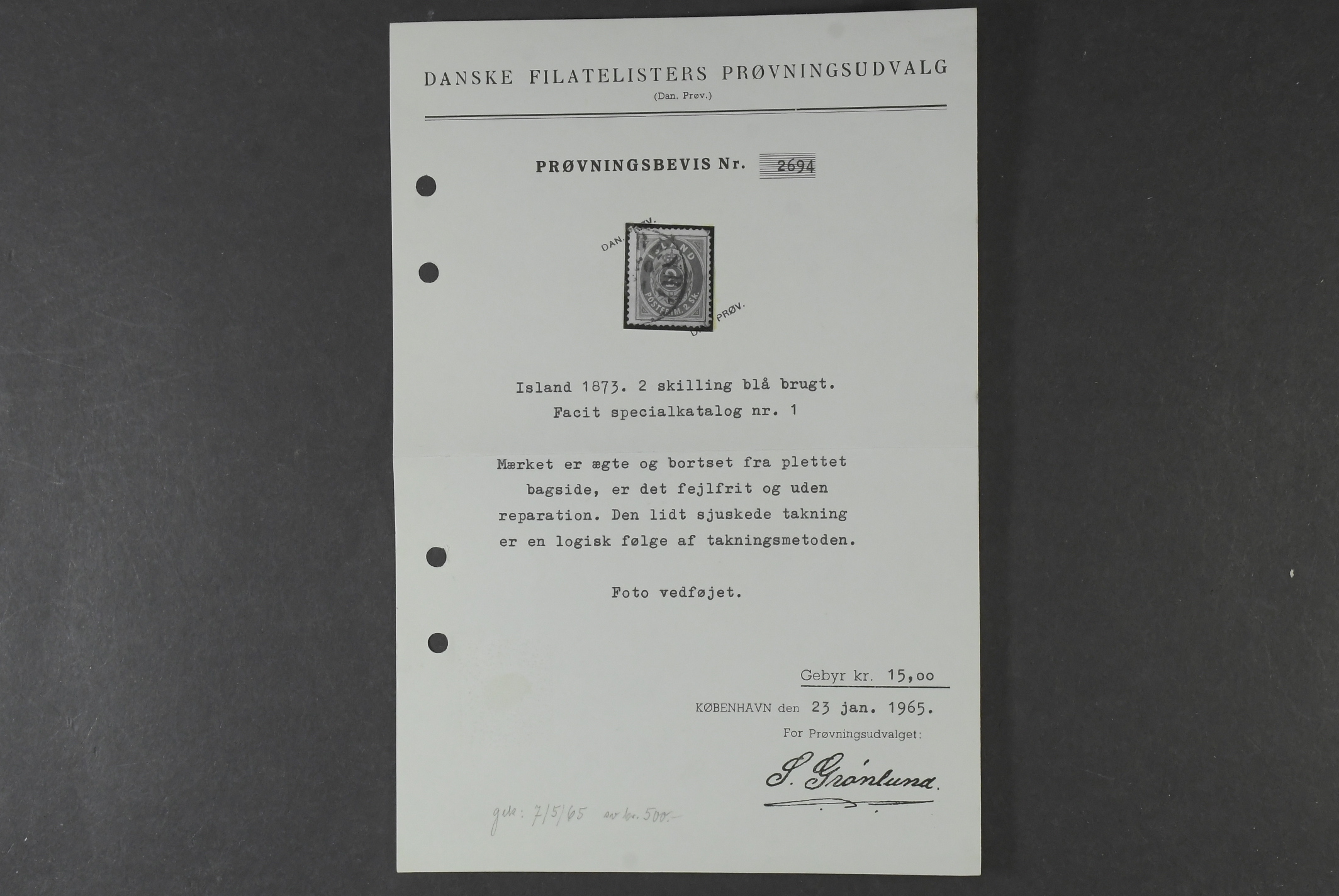 Iceland. Facit 1 used, Used with cert. Grönlund 1965, light discolored patch on back with irregular perfs as always. Almost off-centered. Ex. Contenta.