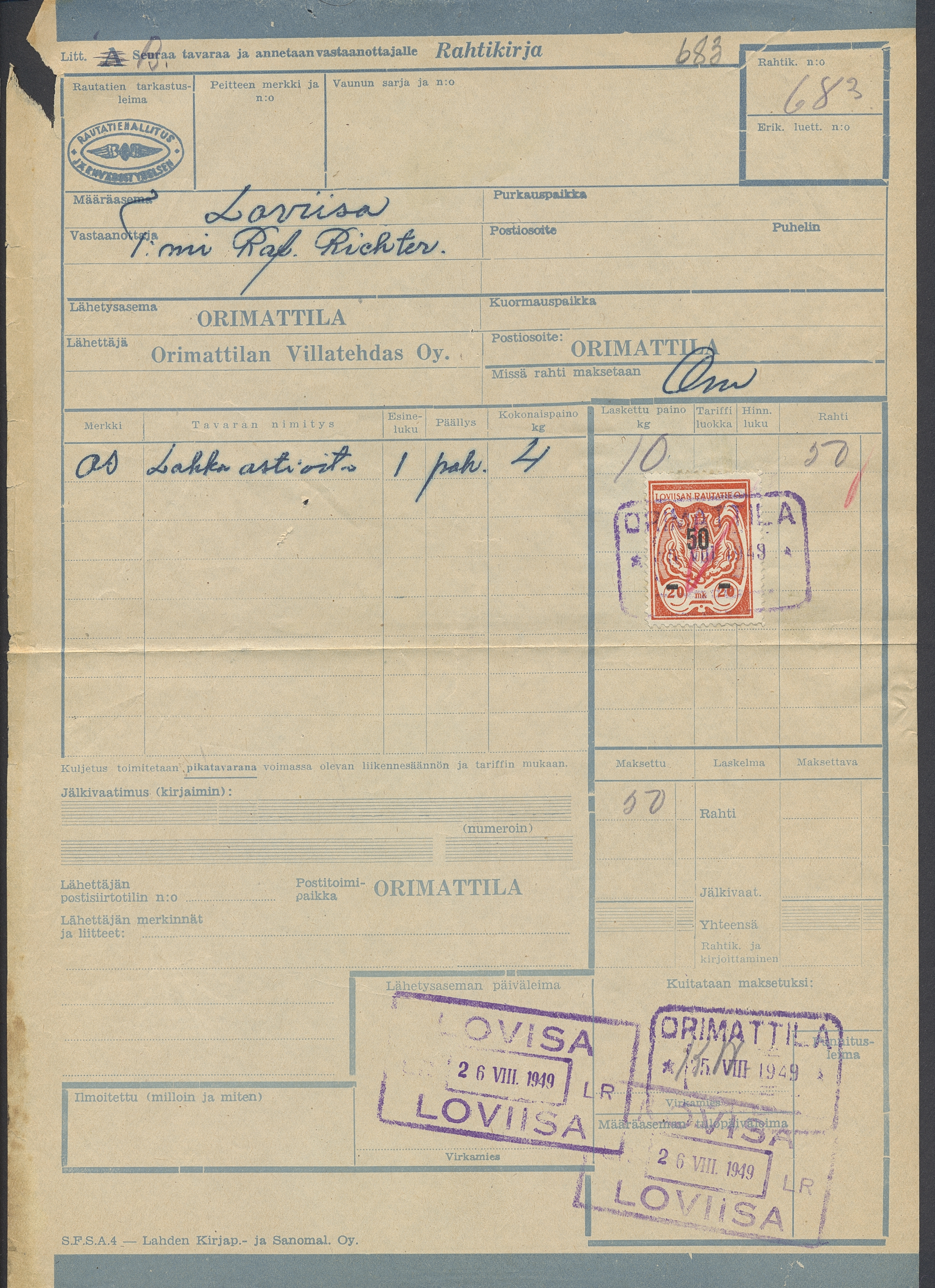 Finland. Freight stamps, collection/accumulation 1940s–1950s in stockbook pages. Railway freight stamps from Jokkis, Lovisa, Rauman and the State Railways. One hundred and four stamps and three on waybills. The entire lot is presented at www.philea.se. (107)