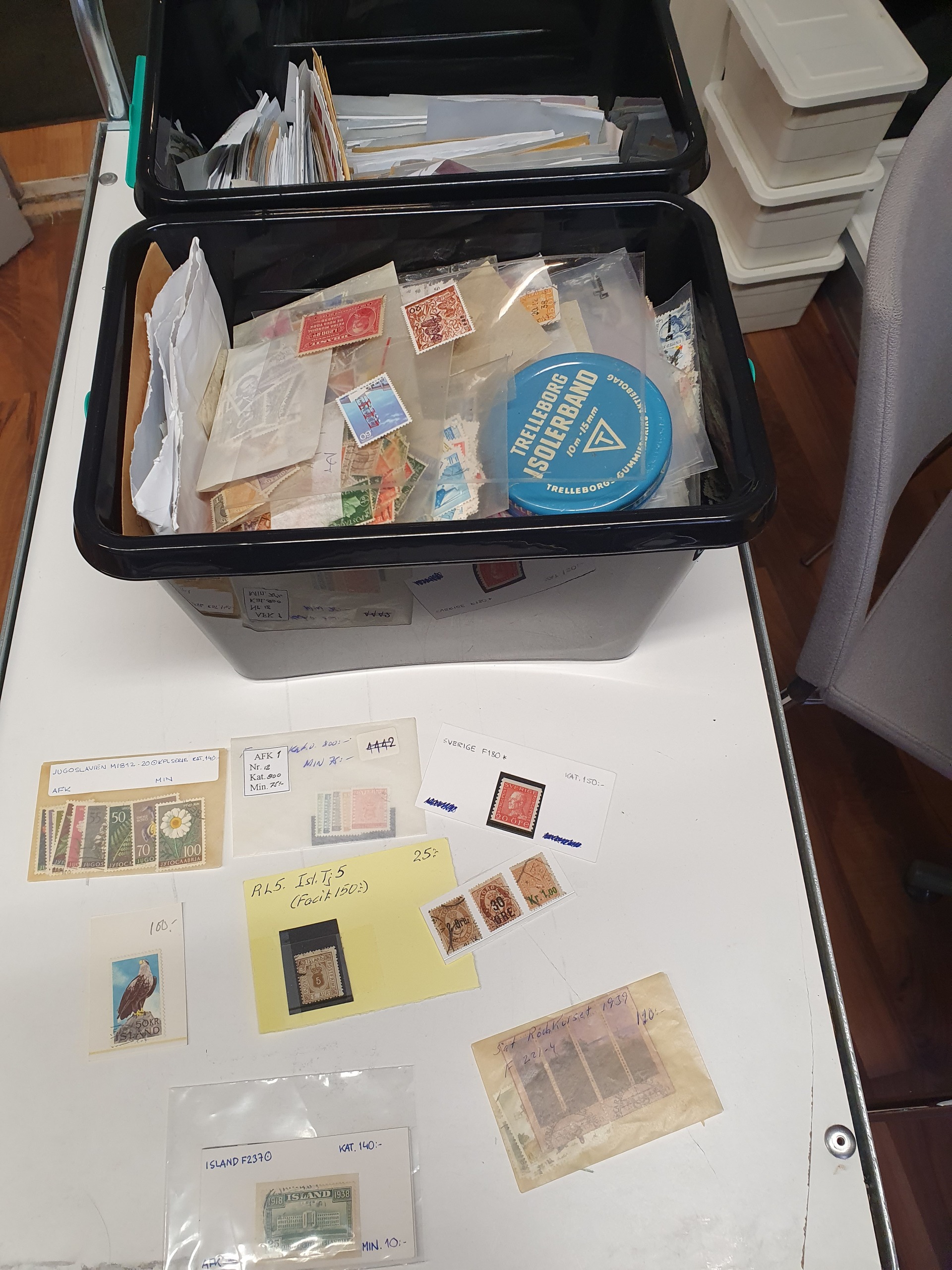 ALL WORLD. Accumulation mostly used 1800s-2000s in box. Two plastic boxes that includes stamps that are stamped in different Swedish communitys. In one of the boxes there are a few stamps that are valued to 700SEK. Please see a selection of scans at www.philea.se. Good quality.