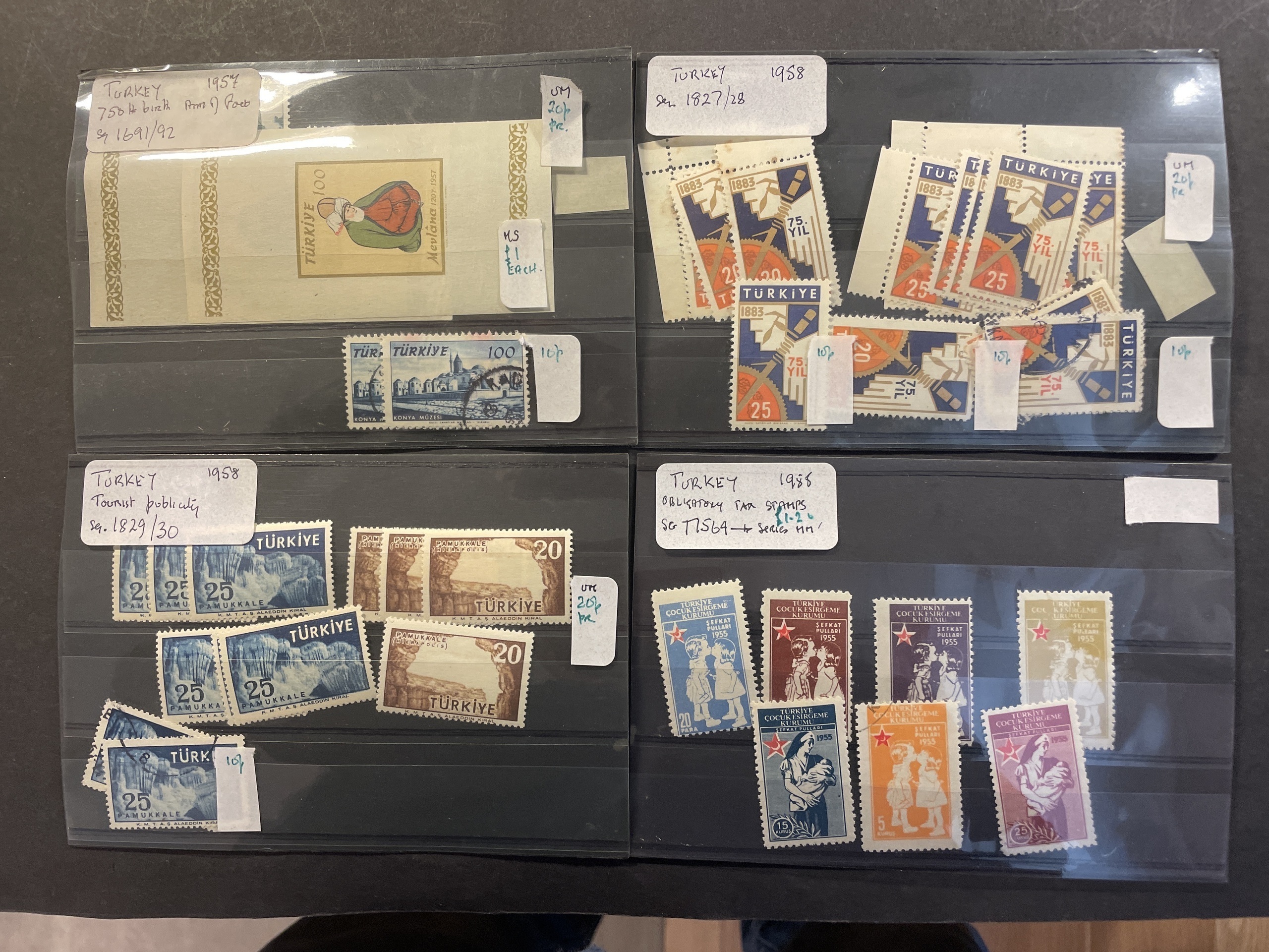 Turkey. ★★/★/⊙. Dealers stock of 20th century, mint and used, sorted on several 100s of stockcards, housed in 5 boxes. No set in great duplication, often a few of each. The mint is virtually all superb MNH and the used all sound. Nearly everything has catalogue numbers and while, strictly speaking, not in absolute chronological order, it is clear that the catalogue potential runs into many 1000s of euro including back of the book. So many different topics here, as well, making it not only suitable for any dealer of the Middle East, also ideal for the thematic collector or dealer. There is much tough to find material here, often ludicrously low in the catalogue. Viewing is a must in order to appreciate the huge potential among the 1000s of sets present.