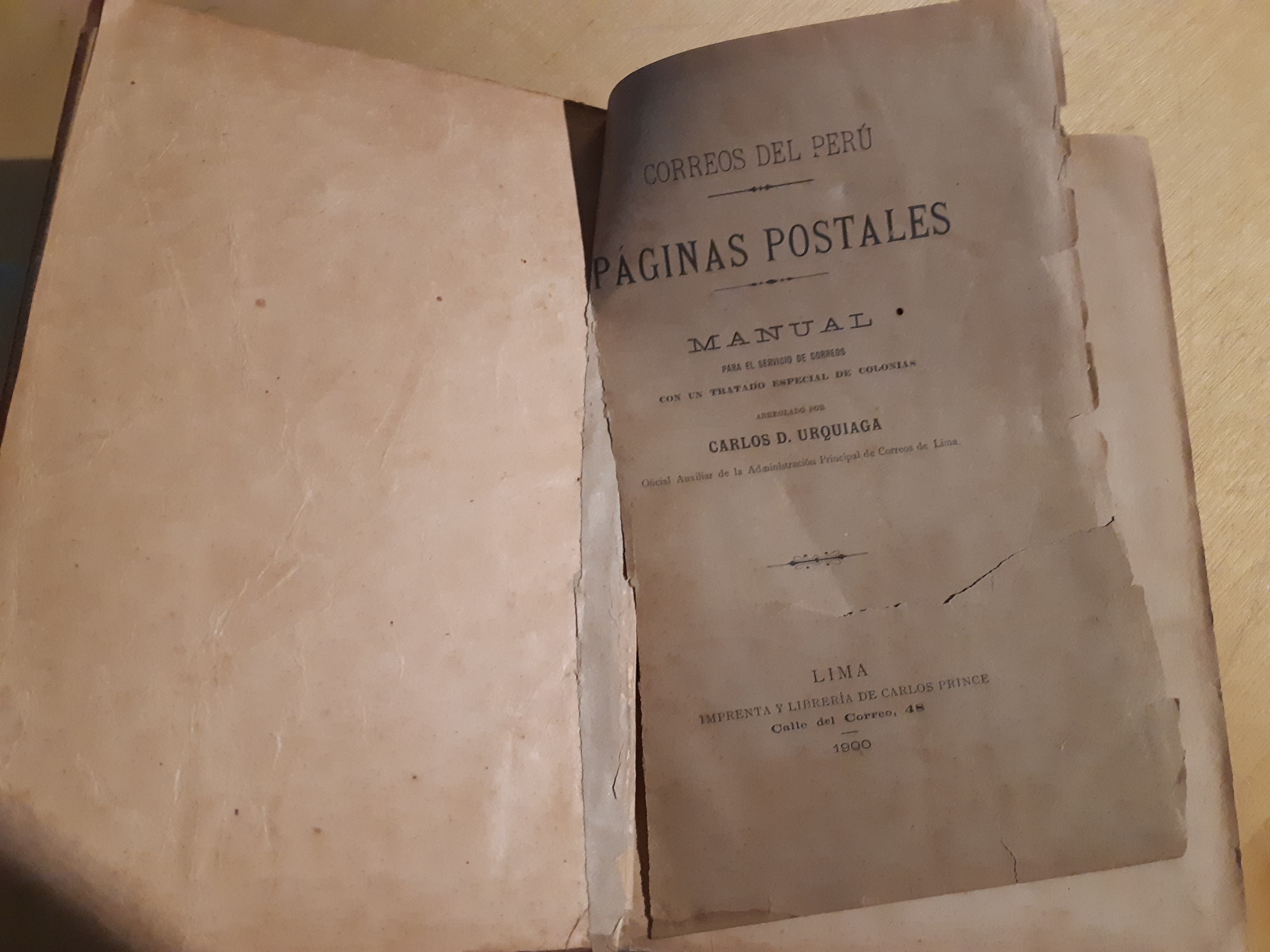 Literature. Urquiaga, C.D., 'Correos del Perú – Páginas postales – Manjual para el servicio de correos con un tratado especial de colonias', Lima 1900, hardcover, 229 pp. Early and very scarce work. Used, with worn cover.