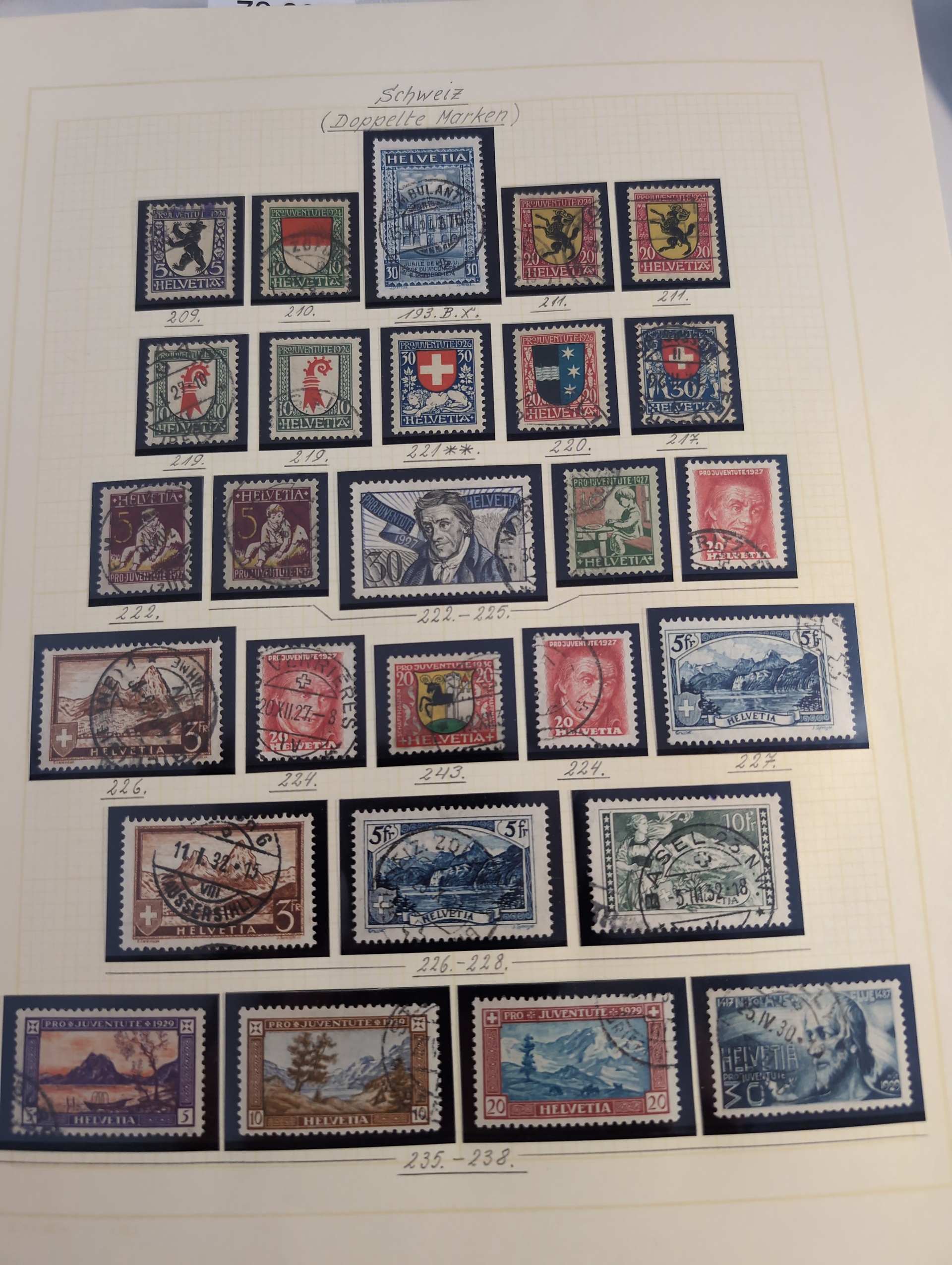 Switzerland. Collection/accumulation mostly used ca. 1900–1970 on leaves. Incl. some better Pro Juventute and Pro Patria, Airmails, etc. Please see a selection of scans at www.philea.se. Mostly fine quality. (500)