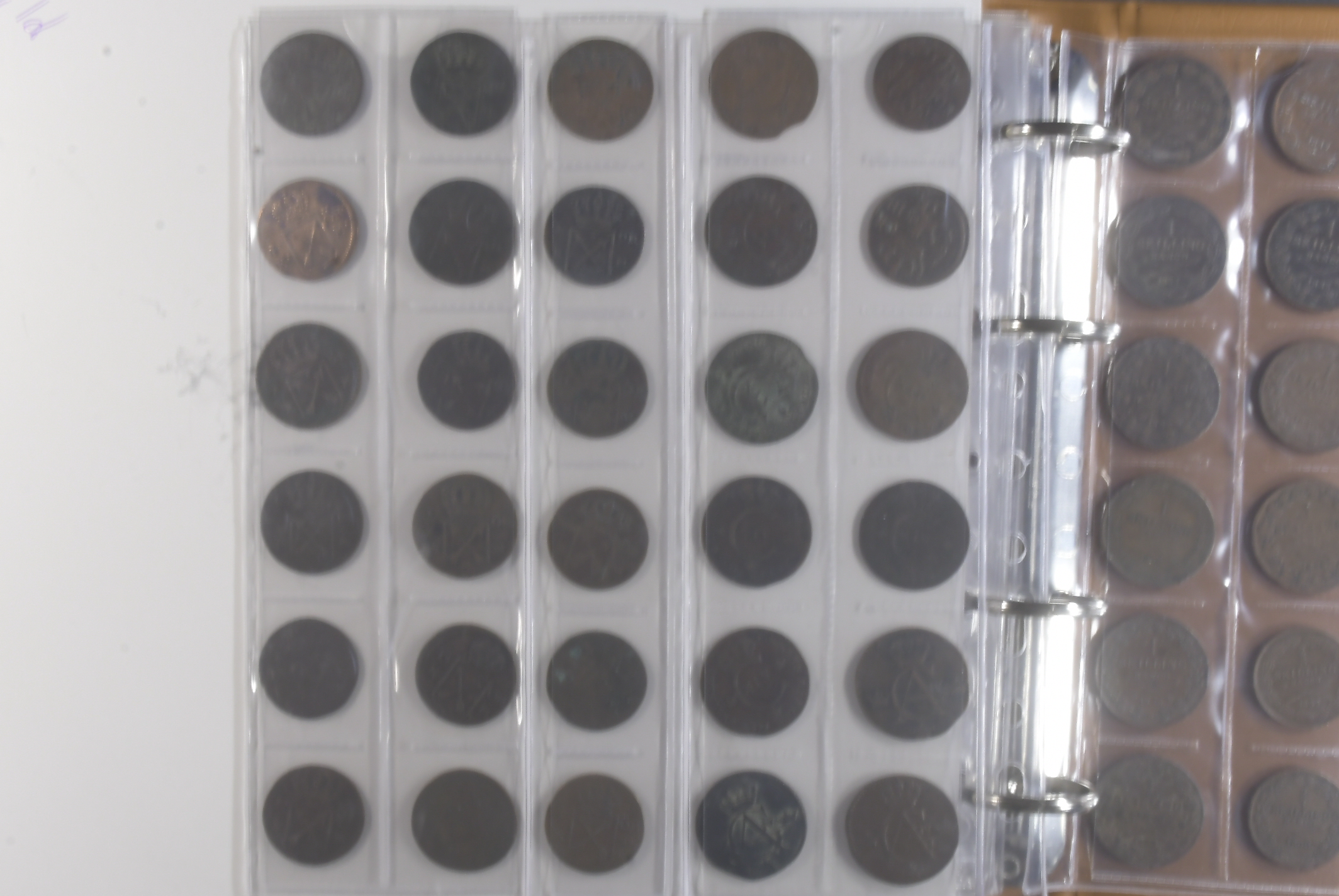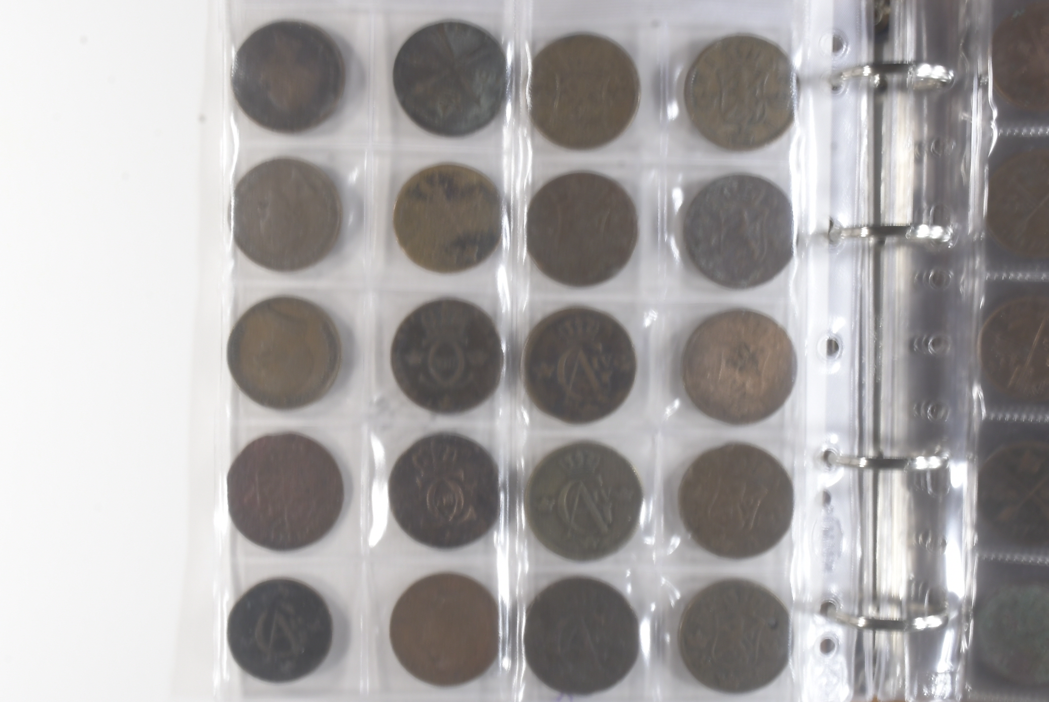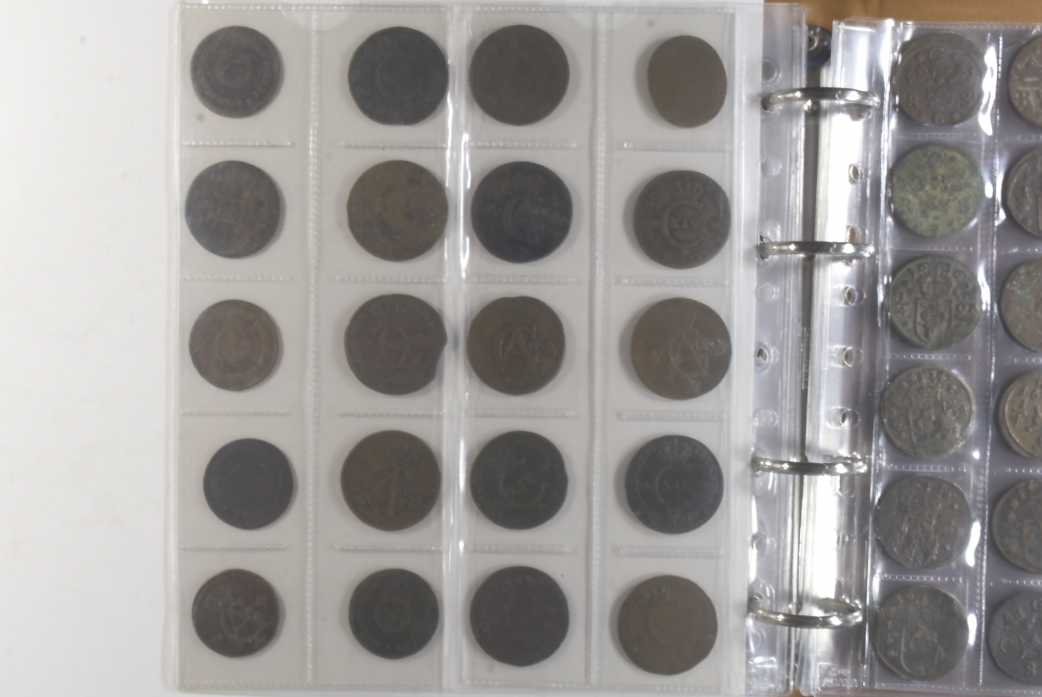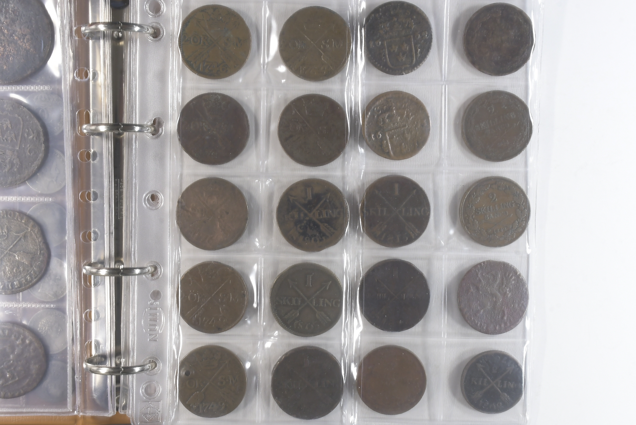 Coins, Sweden. Large collection of silver and copper coins including large size early coppers, over 20 pcs Karl XII emergency coins, pierced (repaired) riksdaler 1772, mounted riksdaler species 1851, etc. In total 227 coins. Please inspect! 1?-01.