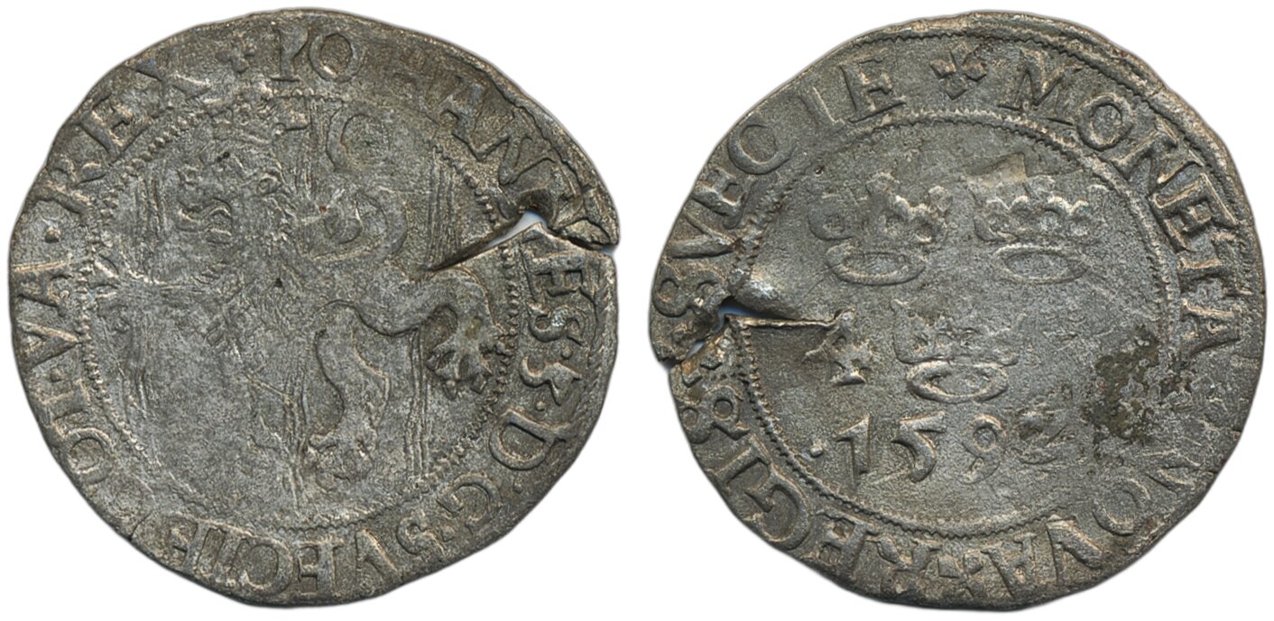 Coins, Sweden. Johan III, SM 71, 4 öre 1592. 3.85 g. Stockholm. Edge damage into coin. Nevertheless a scarce type. 1/1+.