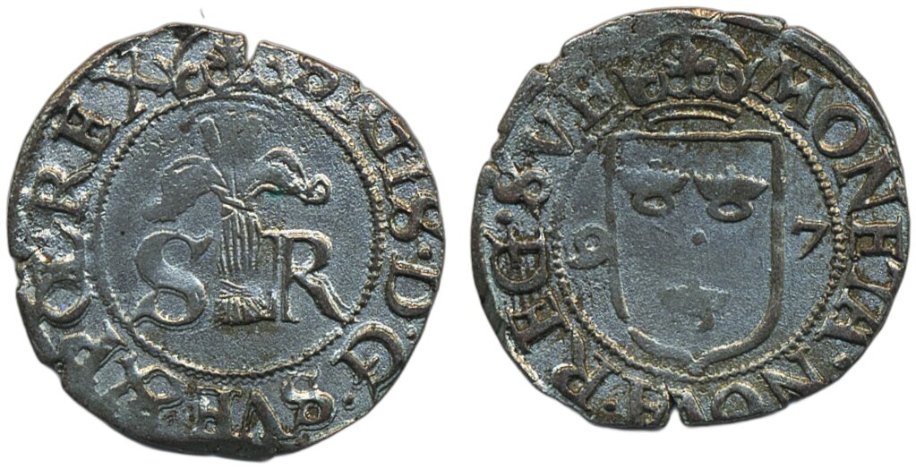 Coins, Sweden. Sigismund, SM 23a, 1/2 öre 1597. 1.76 g. Stockholm. Lightly corroded. 1+.