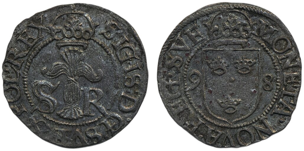 Coins, Sweden. Sigismund, SM 24, 1/2 öre 1598. 1.28 g. Stockholm. Light corrosion. Well struck. 1+/01.