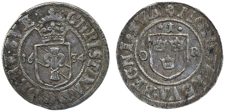 Coins, Sweden. Kristina, SM 85, 1 öre 1634. 1.04 g. Stockholm. 1+/01.