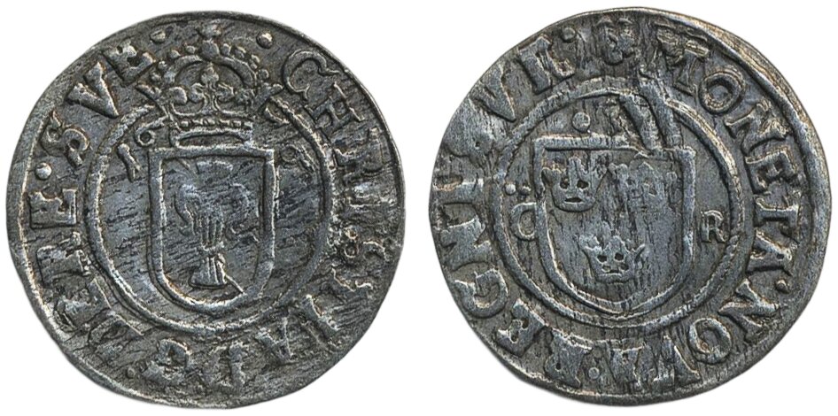 Coins, Sweden. Kristina, SM 87, 1 öre 1636. 1.13 g. Stockholm. Spelling CHRISTIA (missing N). Interesting variety. 1+.