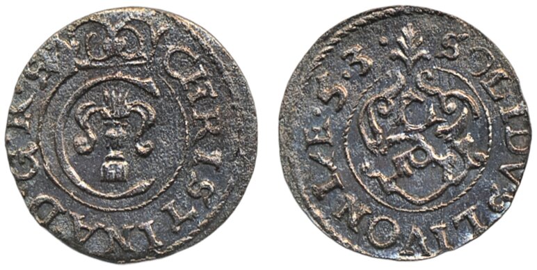 Coins, Swedish possessions, Livonia. Kristina, SB 12, solidus (schilling) 1653. 0.47 g. 01.