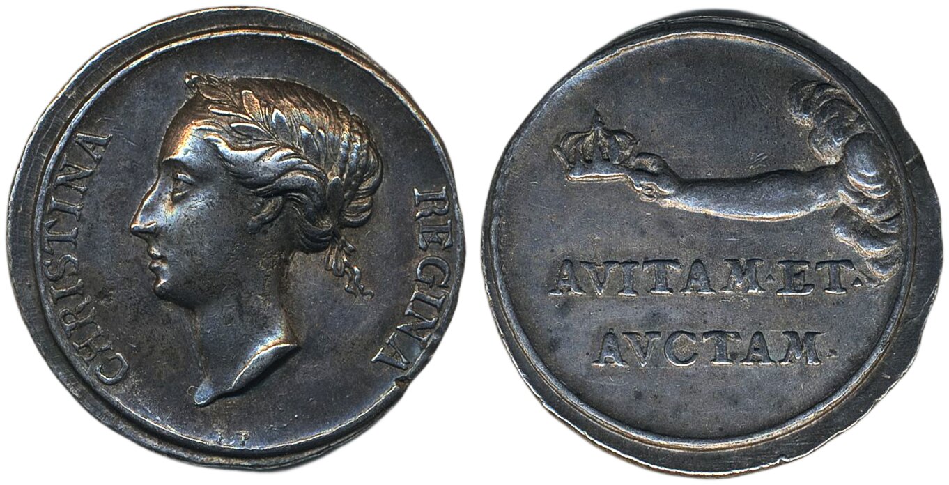 Medals, regal, Sweden. Kristina, Hild. 42A, Coronation medal in silver ND (1650), by Erich Parise. 12.63 g. 28 mm. Attractively toned lustrous example. Ex. Bonde. 01.