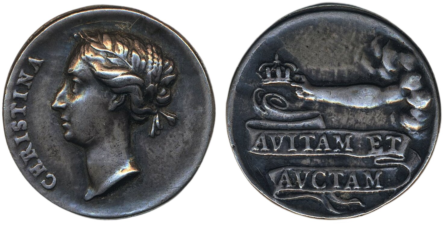 Medals, regal, Sweden. Kristina, Hild. 44, Coronation medal in silver ND (1650), by Erich Parise. 16.69 g. 30 mm. Attractively toned. 1+/01.