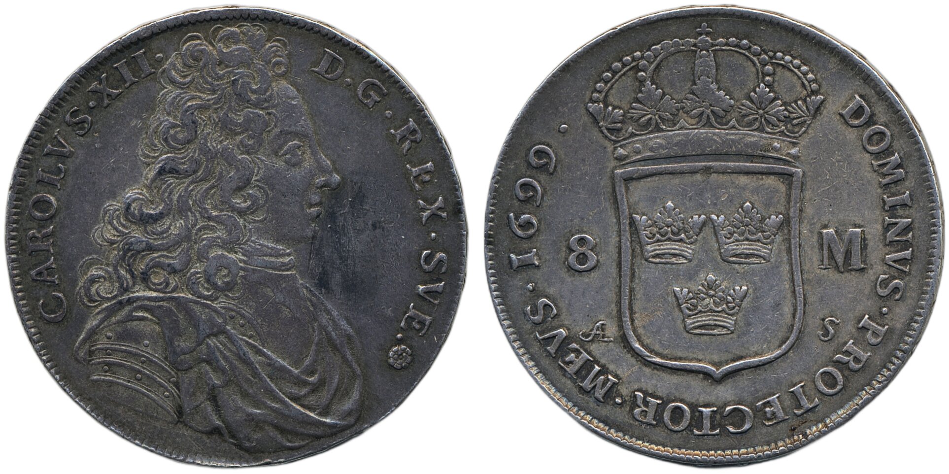 Coins, Sweden. Karl XII, SM 33, 8 mark 1699. 31.42 g. Stockholm. Beautiful patina, small scratches in the right field. R. God 1+.