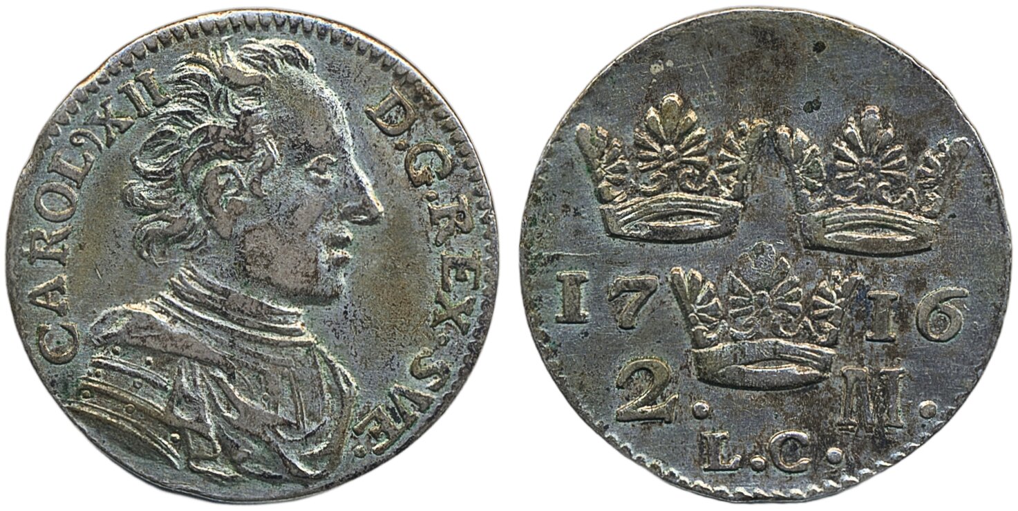 Coins, Sweden. Karl XII, SM 77b, 2 mark 1716. 10.21 g. Stockholm. 1+.