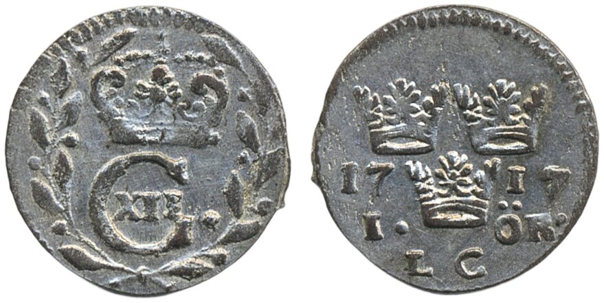 Coins, Sweden. Karl XII, SM 141, 1 öre 1717. 1.23 g. Stockholm. 1+.
