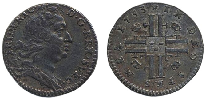 Coins, Sweden. Fredrik I, SM 51b, 1/4 dukat 1733. 1.11 g. Stockholm. Off-metal strike in silver. 01.