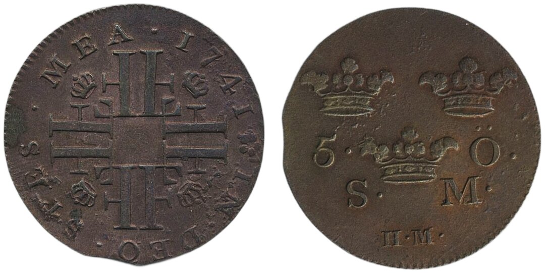 Coins, Sweden. Fredrik I, SM 145 (for genuine), 5 öre 1741. 3.36 g. Contemporary forgery in copper. 1+.