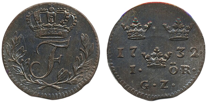 Coins, Sweden. Fredrik I, SM 169, 1 öre 1732. 1.18 g. Stockholm. Nicely toned with underlying lustre. 01.