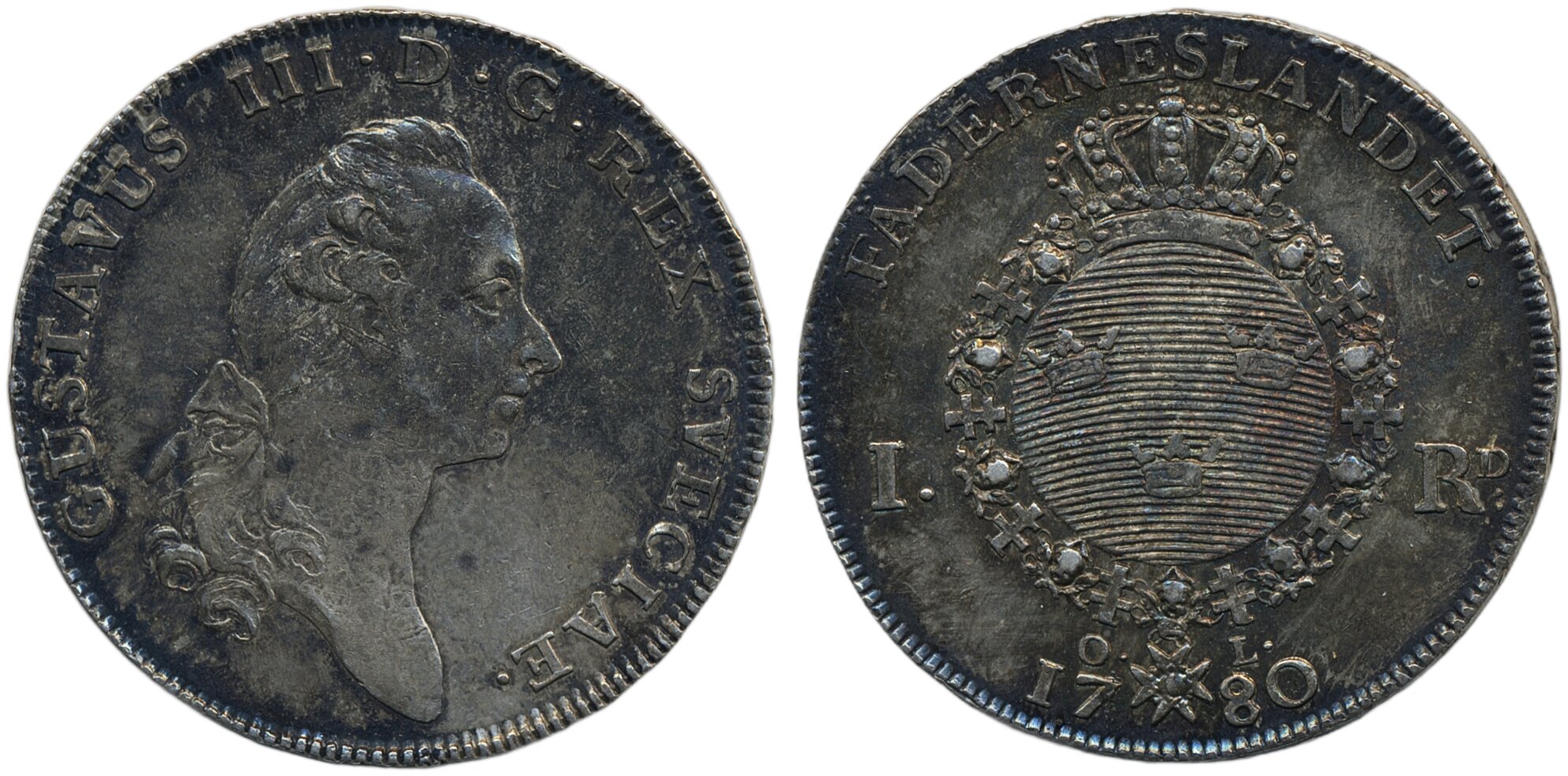 Coins, Sweden. Gustav III, SM 46, 1 riksdaler 1780. 29.29 g. Stockholm. Beautifully toned example with lustrous reverse. 1+/01)(01.