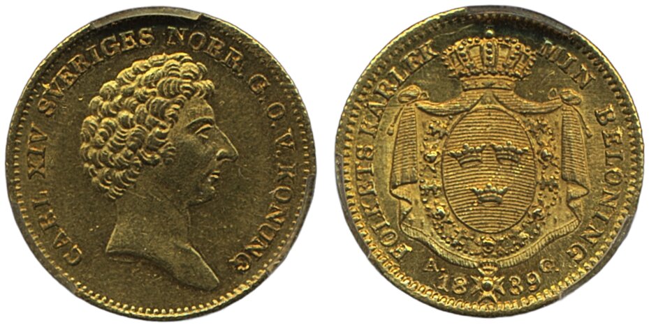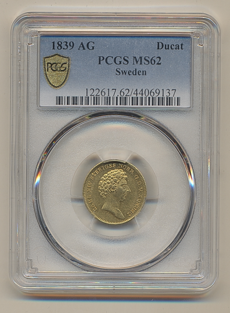 Coins, Sweden. Karl XIV Johan, SM 34, 1 dukat 1839. Sole finest graded by PCGS as MS62. 01/0. See certification at PCGS