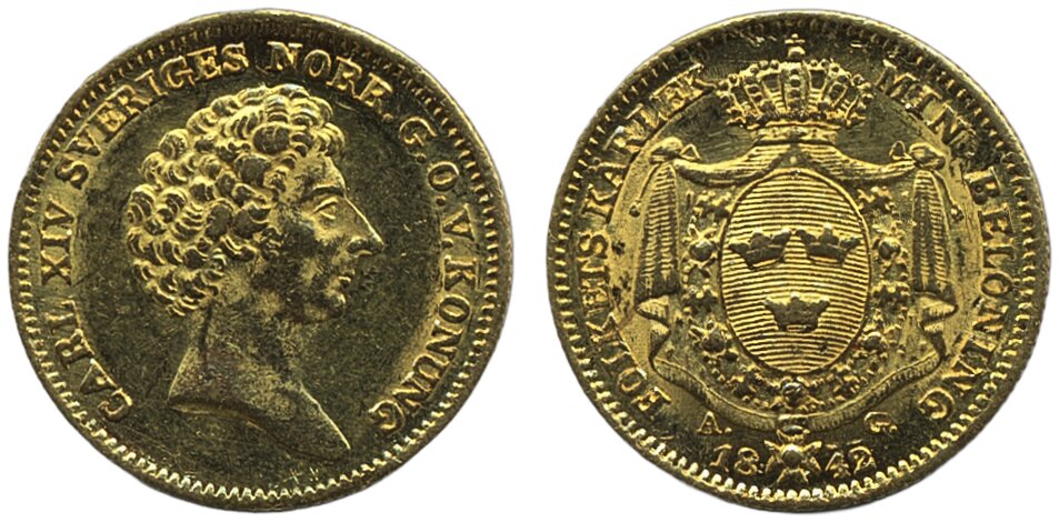 Coins, Sweden. Karl XIV Johan, SM 37, 1 dukat 1842. Lightly cleaned. 1+/01.