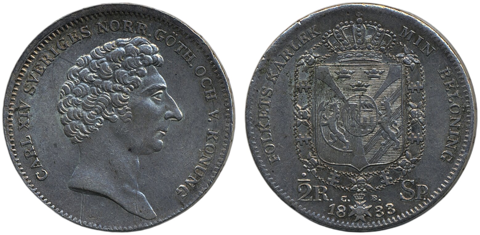 Coins, Sweden. Karl XIV Johan, SM 75, 1/2 riksdaler specie 1833. Lustrous example with two small obverse scratches. 1+/01.