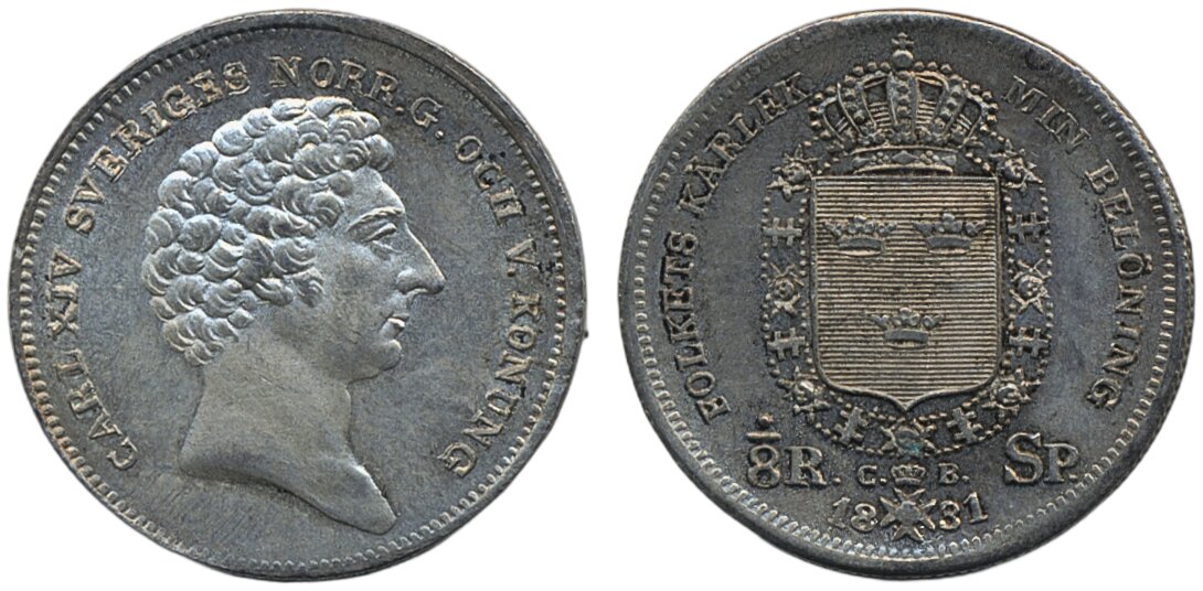 Coins, Sweden. Karl XIV Johan, SM 85, 1/8 riksdaler specie 1831. Lustrous example. 01.