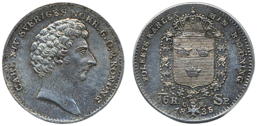 Coins, Sweden. Karl XIV Johan, SM 95, 1/16 riksdaler specie 1835. 01/0.