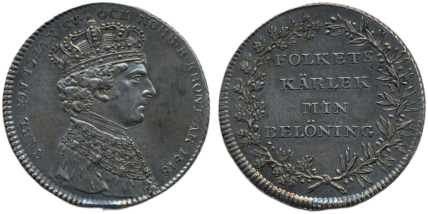 Coins, Sweden. Karl XIV Johan, SM 97a, 1/3 riksdaler (largesse money) 1818. 9.46 g. Stockholm. Cleaned/hairlines. Planchet flaw at edge. 1+.