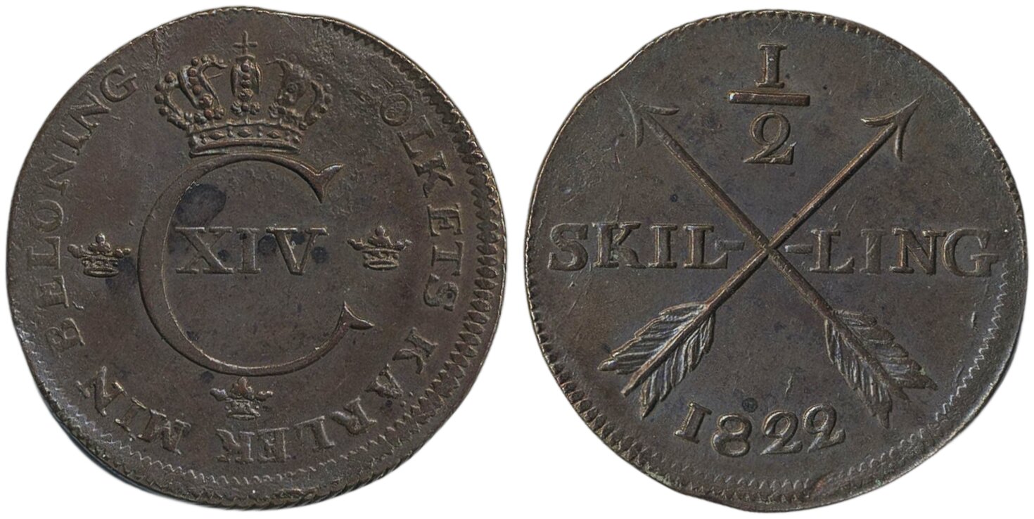 Coins, Sweden. Karl XIV Johan, SM 111a, 1/2 skilling 1822. 8.88 g. Avesta. Lustrous example. Minor edge clip from production. 01.