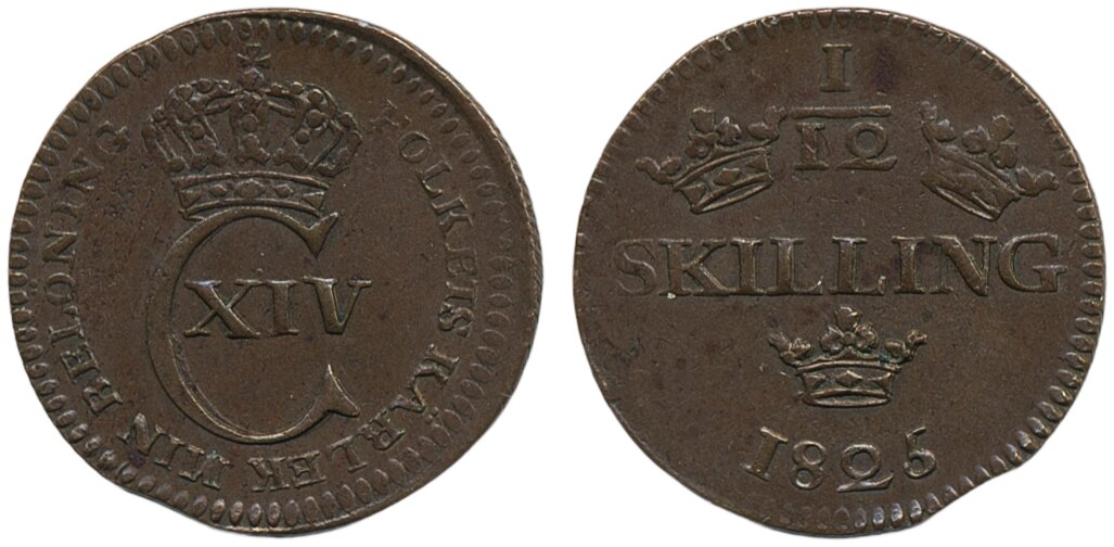Coins, Sweden. Karl XIV Johan, SM 129, 1/12 skilling 1825. 2.27 g. Avesta. Minor edge clip from production. 01.