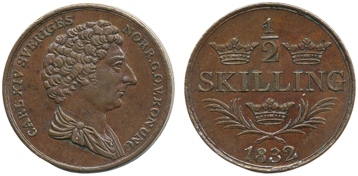 Coins, Sweden. Karl XIV Johan, SM 131, 1/2 skilling palmkvist 1832. 1+/01.