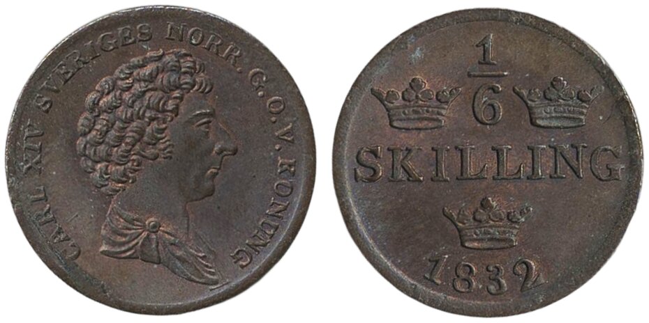 Coins, Sweden. Karl XIV Johan, SM 136b, 1/6 skilling 1832. Planchet flaw on obverse. 01/0.