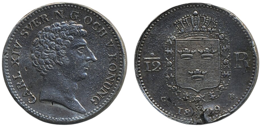 Coins, Sweden. Karl XIV Johan, SM 186b, 1/12 riksdaler 1829. 4.40 g. Pattern coin with reverse planchet flaw are surface porosity. 1+.